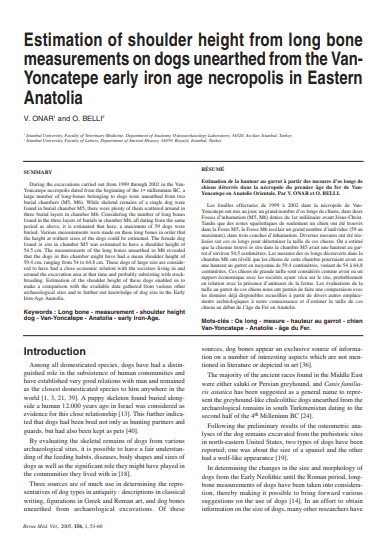 Omuz yüksekliğinin, köpeklerin değişkenliklerini açıklamanın yanı sıra fiziksel görünümlerini açıklamakta en kullanışlı bileşen olduğu açıkça bildirilmiştir (Clark, 1995). Uzun kemiklerin ve kafataslarının incelenmesi bu amaç için özellikle ilginçtir (Boessneck, 1956; Wyrost ve Kucharczyk, 1967a, b; von Driesch ve Boessneck, 1974; Harcourt, 1974; Onar ve diğerleri, 2002; Onar ve Belli, 2005; Teichert, 1969). Bu veriler, aynı zamanda, sadece iskelet veya avcı ödülleri fragmanlarına erişilebildiklerinde, mevcut popülasyonlardaki vahşi canlı hayvanlarla ilgili araştırmalar için de yararlı olabilir (genellikle kafatasları; Okarma ve Buchalczyk, 1993; Simonsen ve diğerleri, 2003; Sumin´skiSumin´ski ve Kobryn, Kobryn, 1980; Wustinger ve diğerleri, 2005). ...